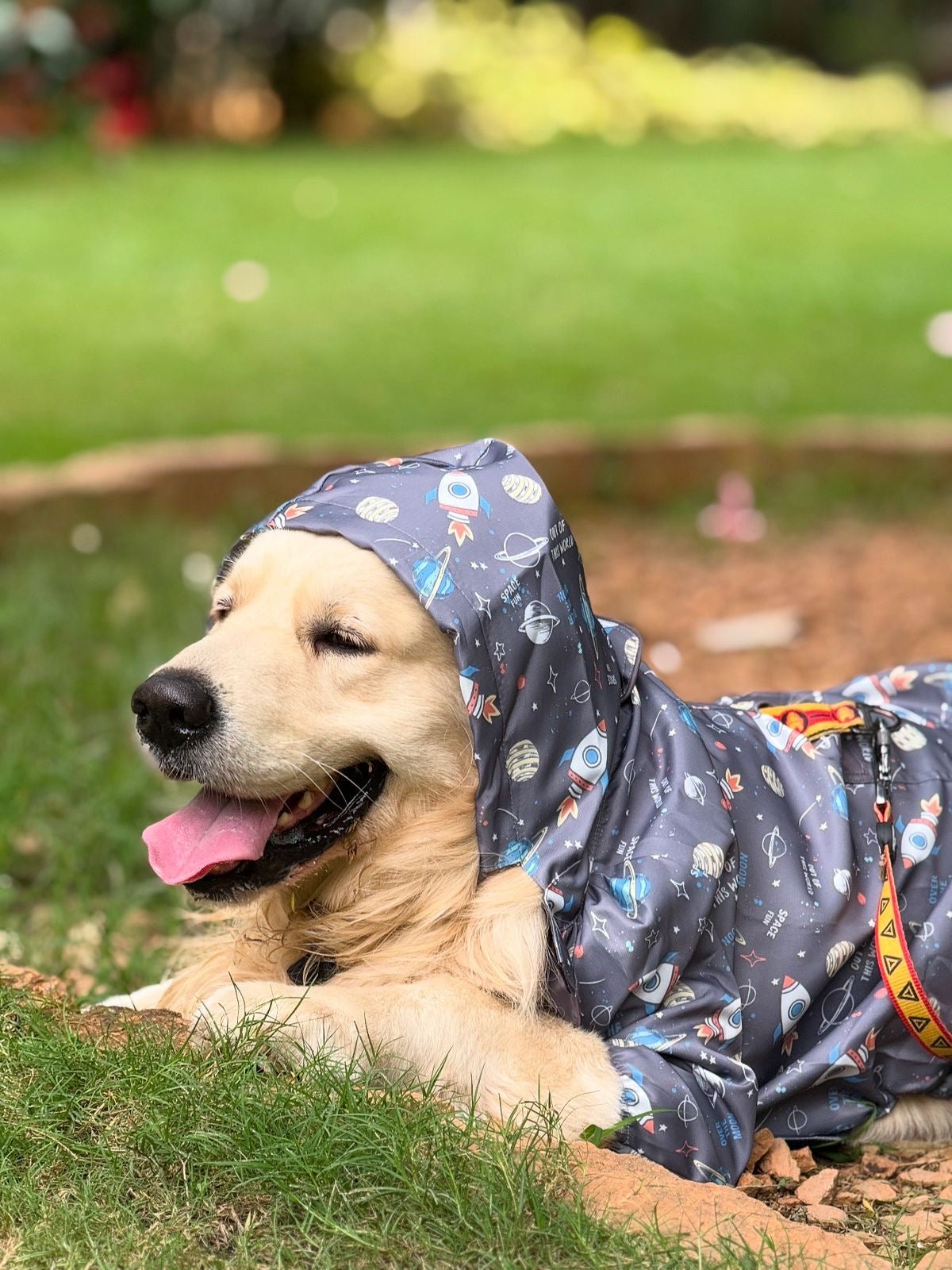 Rainy days don’t have to mean muddy paws and soggy fur. Our Stylish Full-Body Space Print Raincoat is designed to give your dog full coverage, ultimate comfort, and a look that's straight out of a sci-fi runway.